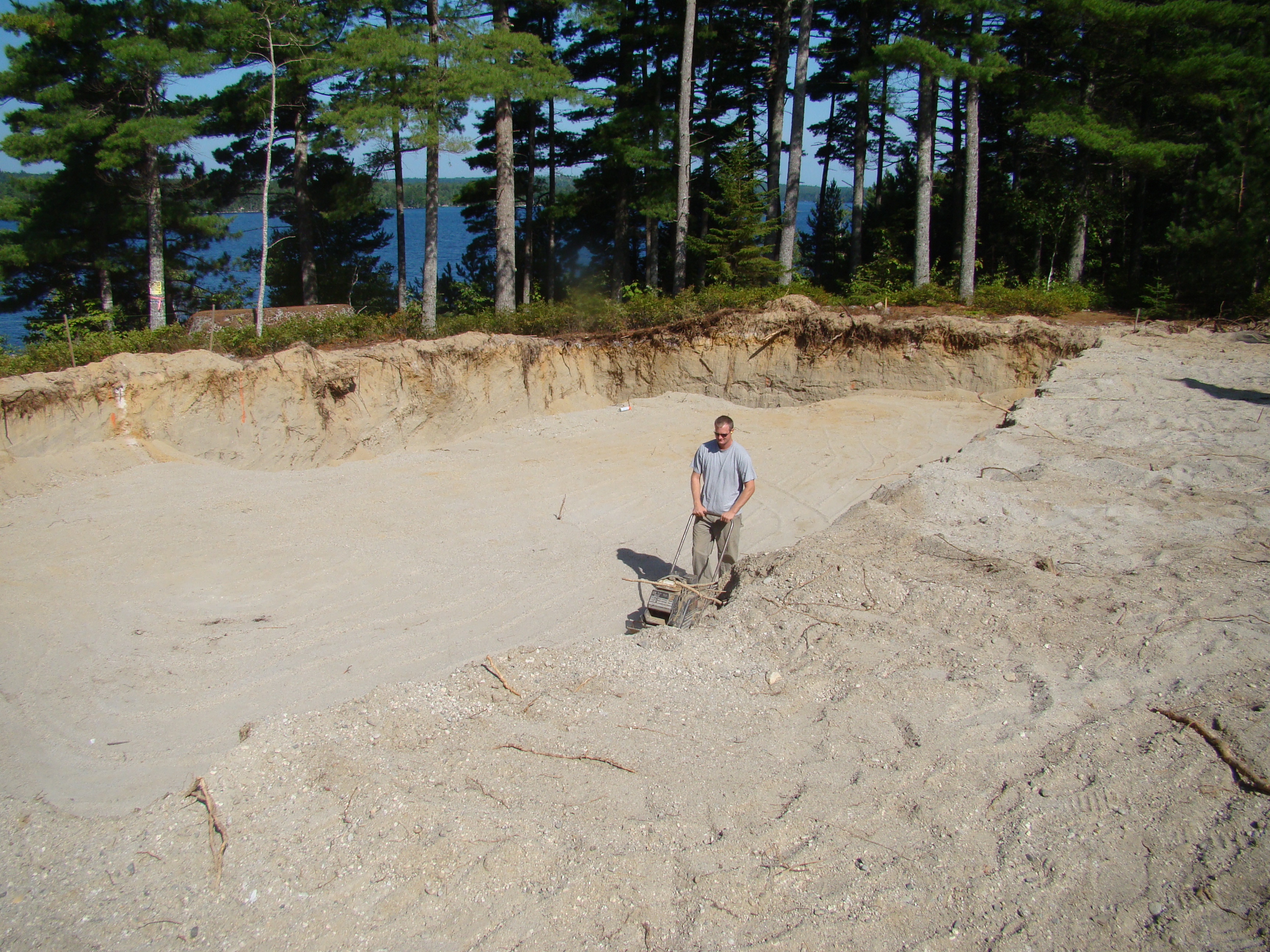 Nate compacting the sand in the hole in the ground destined to become the basement.